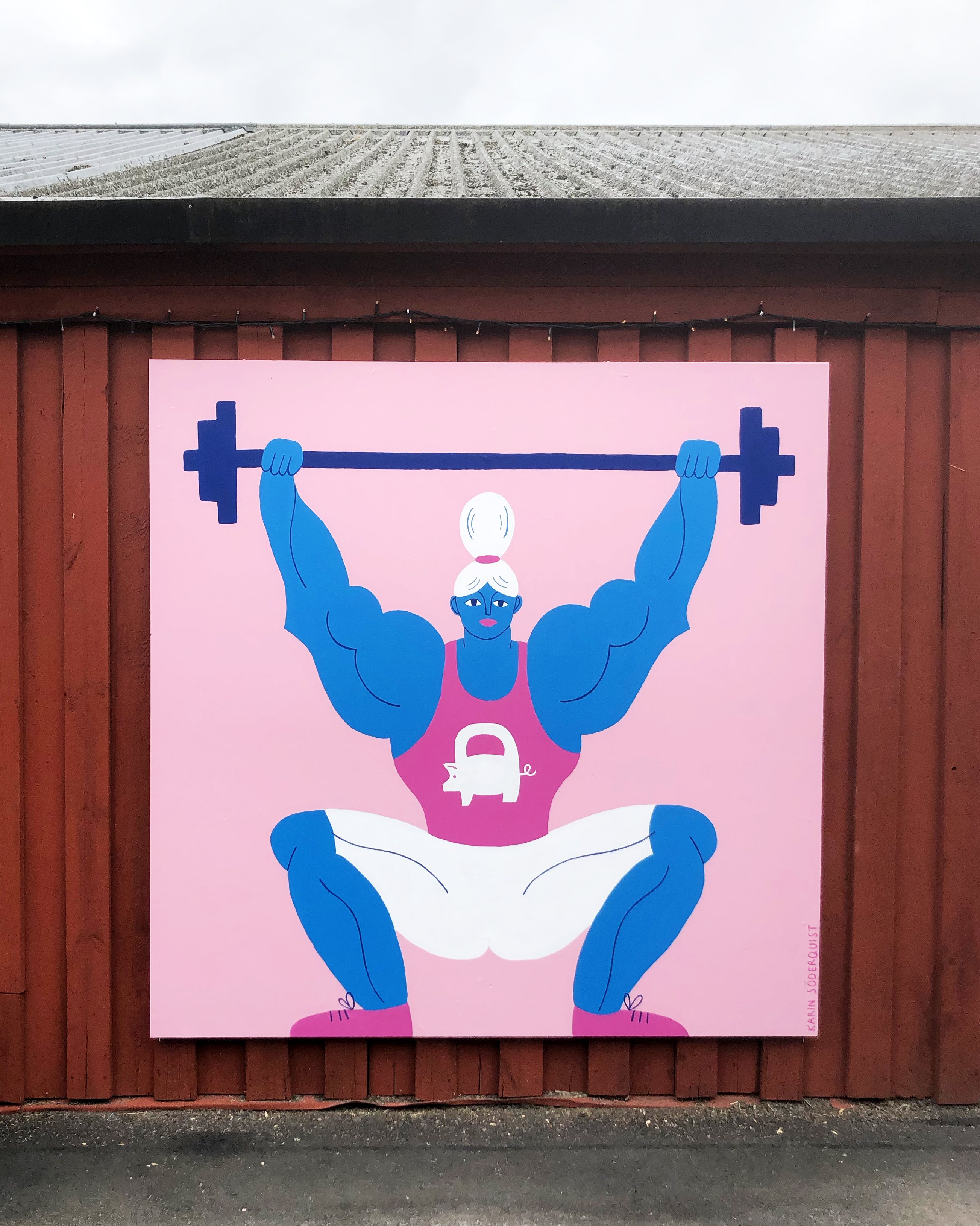 Bures Box is a crossfit gym located in Strängnäs, Sweden. I was invited to paint three 2x2 meter murals outside their entrance. Each painting depicts a woman in a different crossfit pose wearing a top with the Bures Box kettlebell-pig logo painted on it.