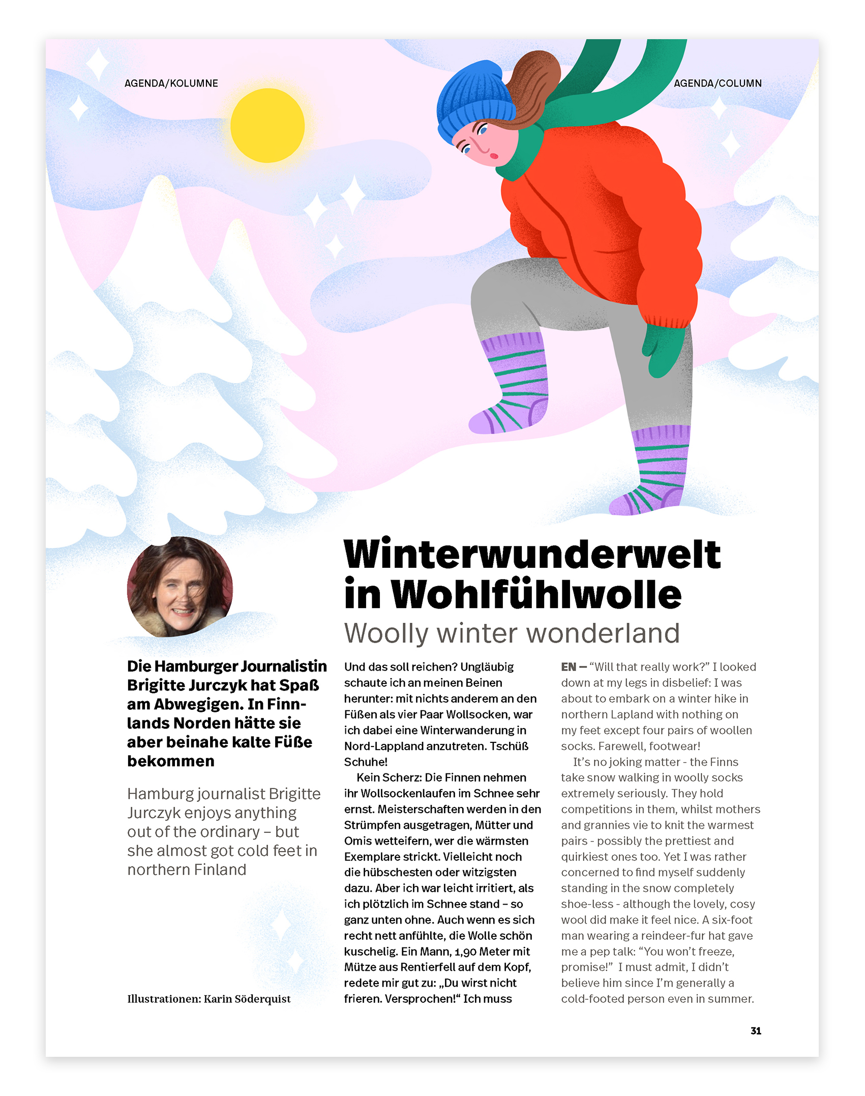 ”Hamburg journalist Brigitte Jurczyk enjoys anything out of the ordinary – but she almost got cold feet in northern Finland” Editorial illustrations for Eurowings inflight magazine WINGS.